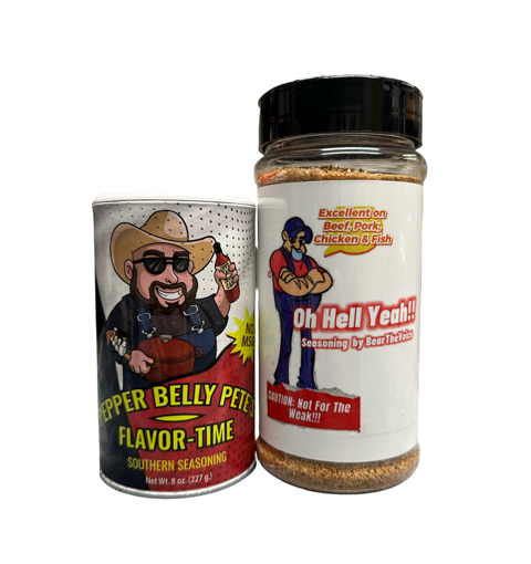 Sauce Dudes Dynamic Duo consists of Pepper Belly Pete's Flavor-Time Southern Seasoning and Cooking With Bear's Oh Hell Yeah!! Seasoning.